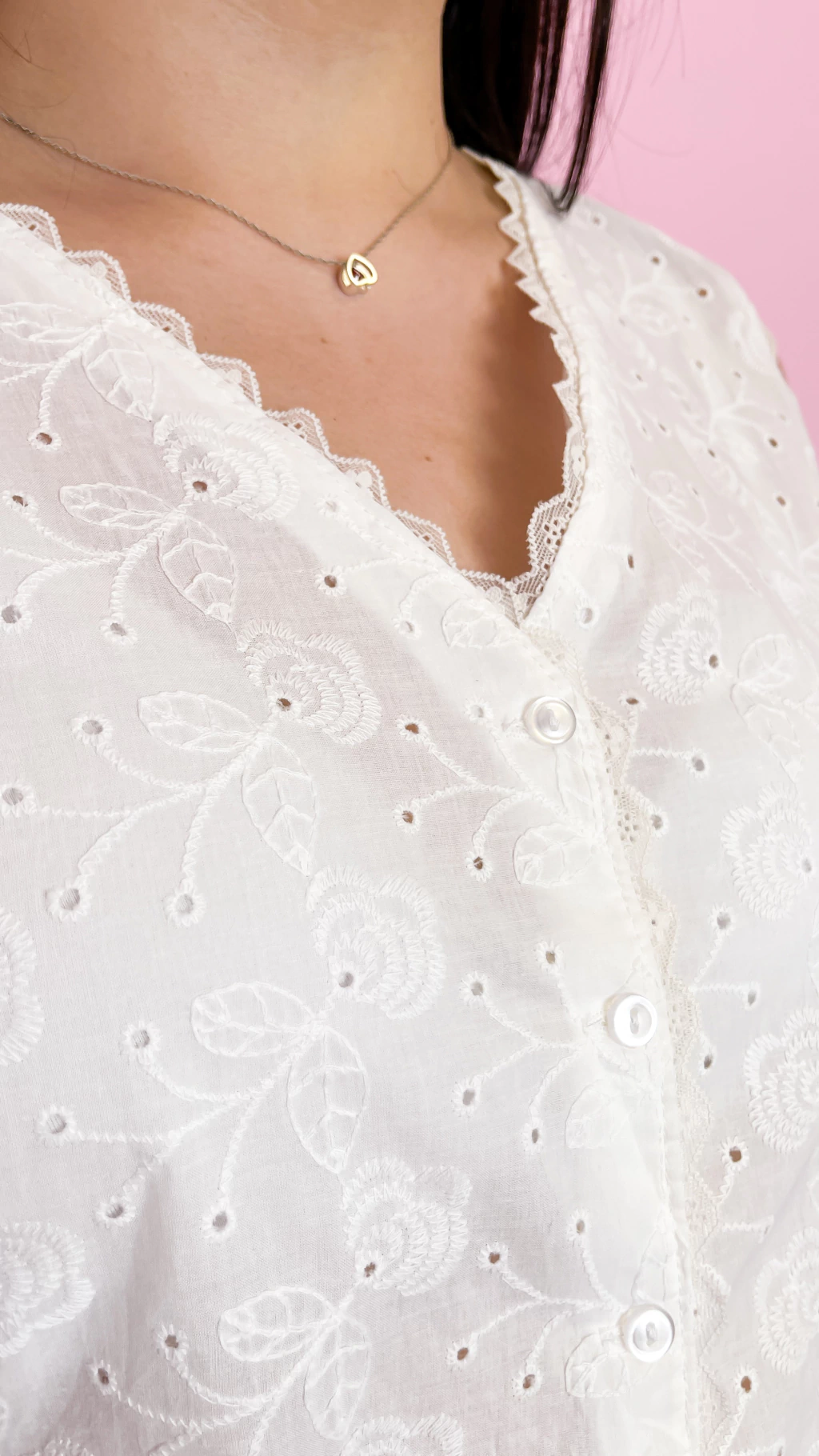 Tiene tiras anchas y un escote en V, ambos rematados con puntilla color crudo en cuello y sisa, un detalle que lo hace aún más especial. En el frente, la prenda termina en punta, mientras que la espalda es recta. Sus botones transparentes acompañan sin restarle protagonismo al broderie.