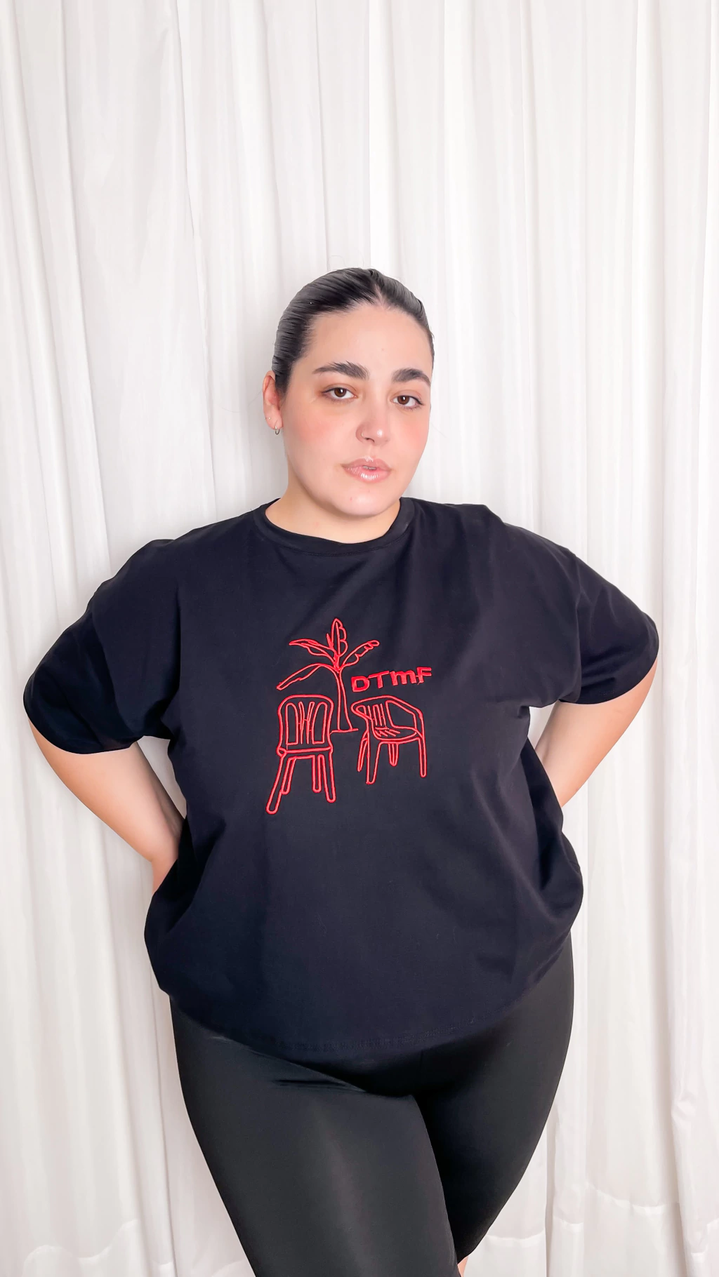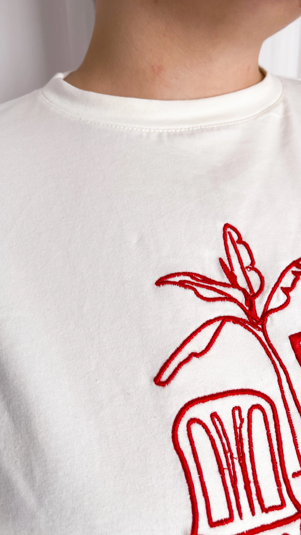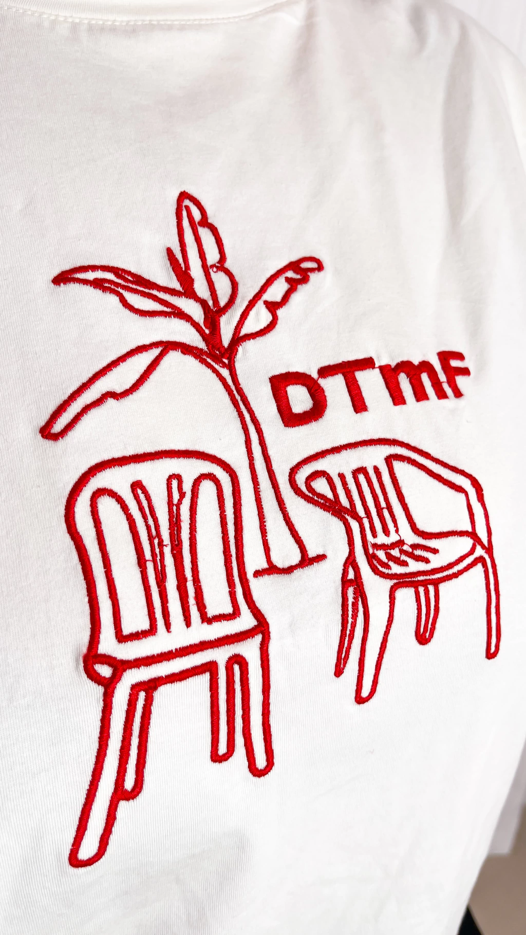 El detalle que amamos: un bordado central en hilo rojo con una palmera, dos sillas y las letras “DTMF”, un guiño sutil pero lleno de onda.