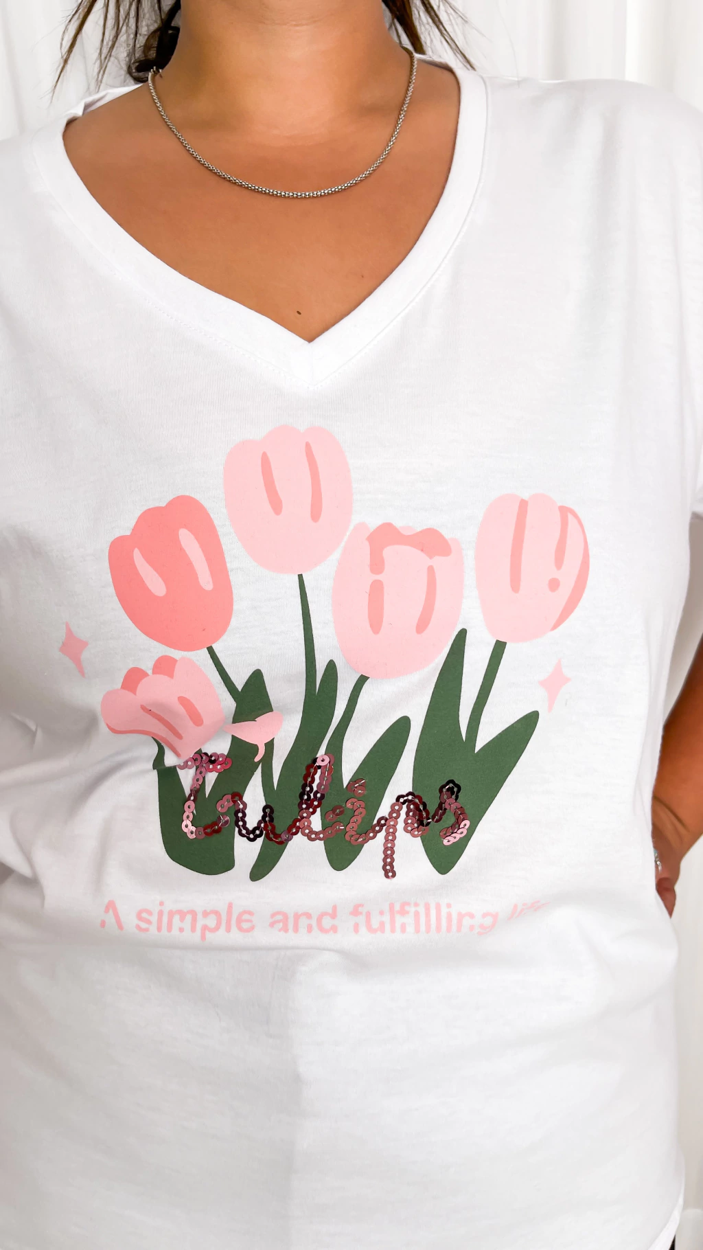 Su estampa central en la parte de adelante tiene tulipanes y bordado en lentejuelas la palabra "TULIPS" y en estampa la frase "A SIMPLE AND FULLFILLING LIFE"
